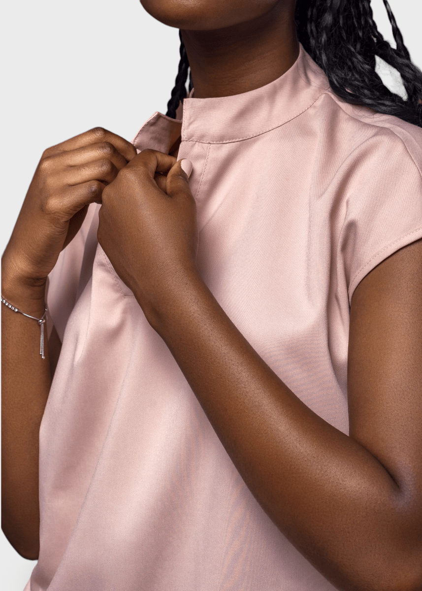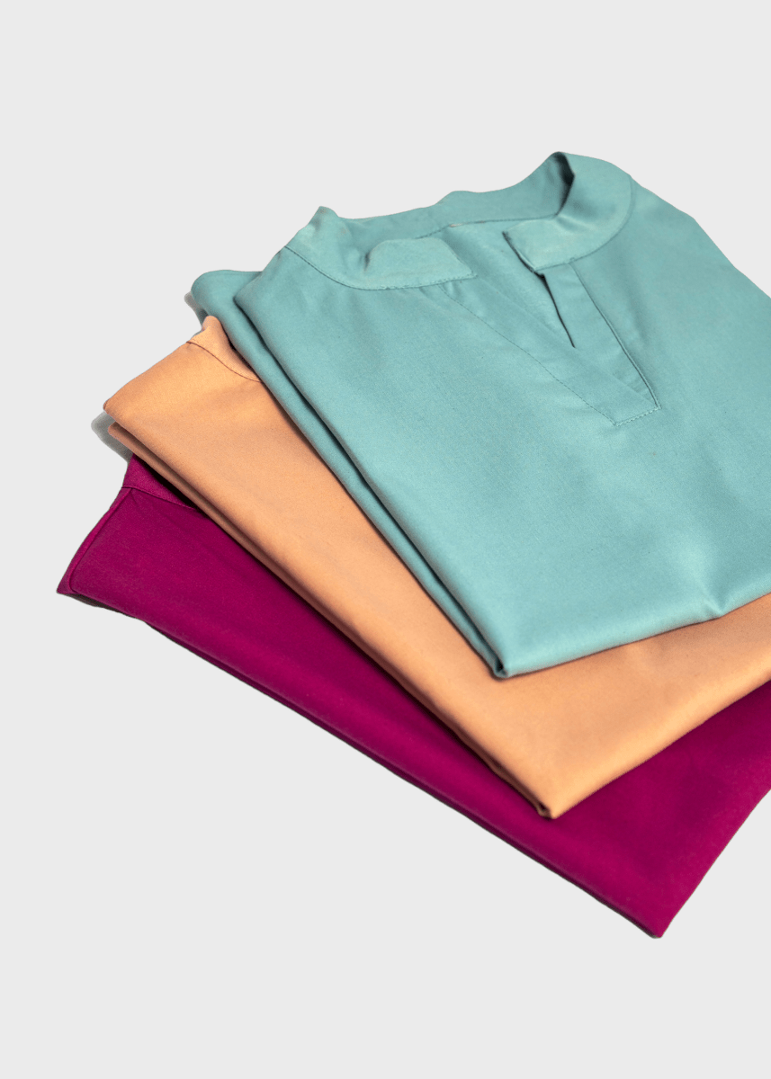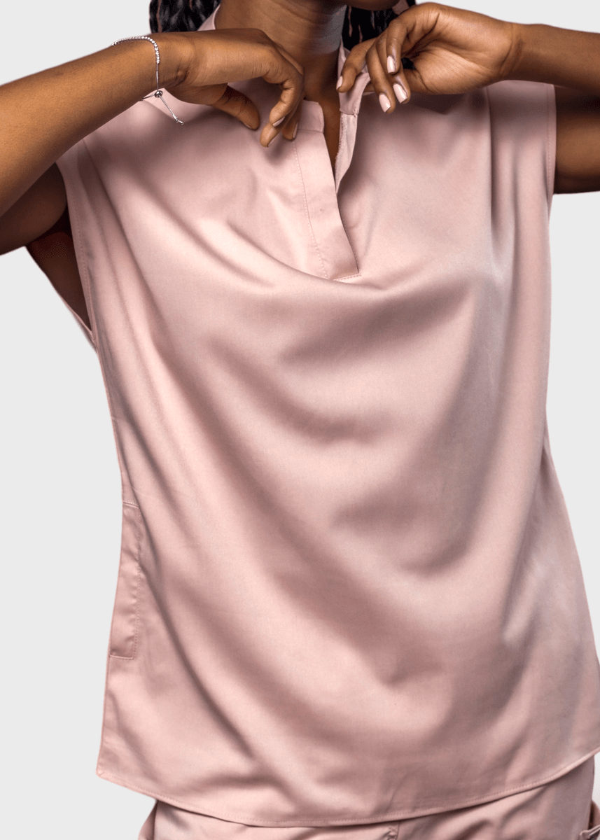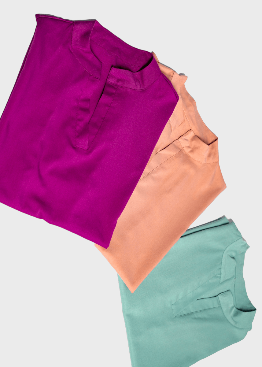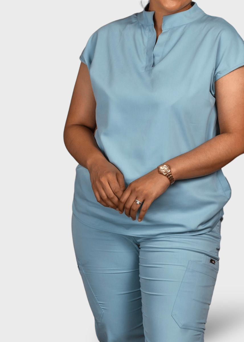 Loose-fitting scrub top, features a Tibetan-inspired collar, designed to prioritize flexibility.
