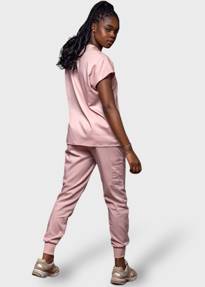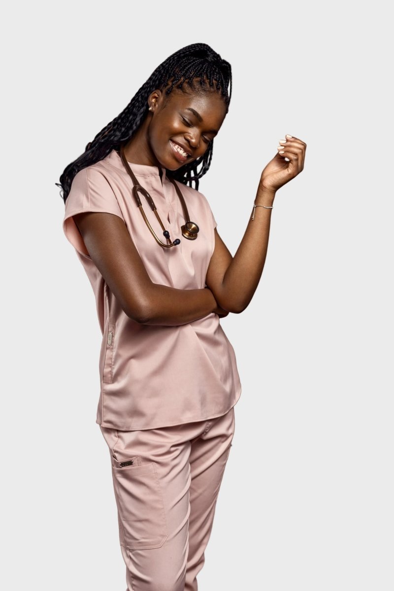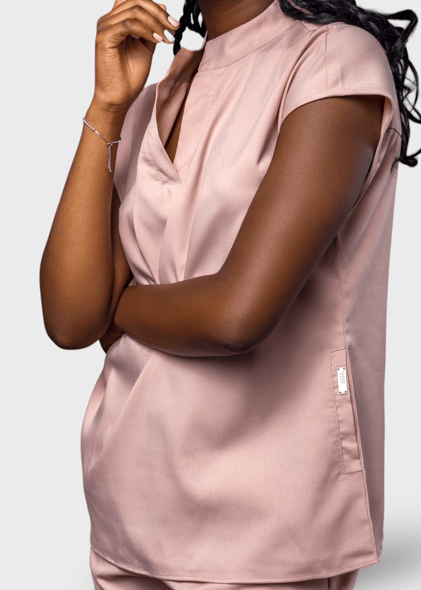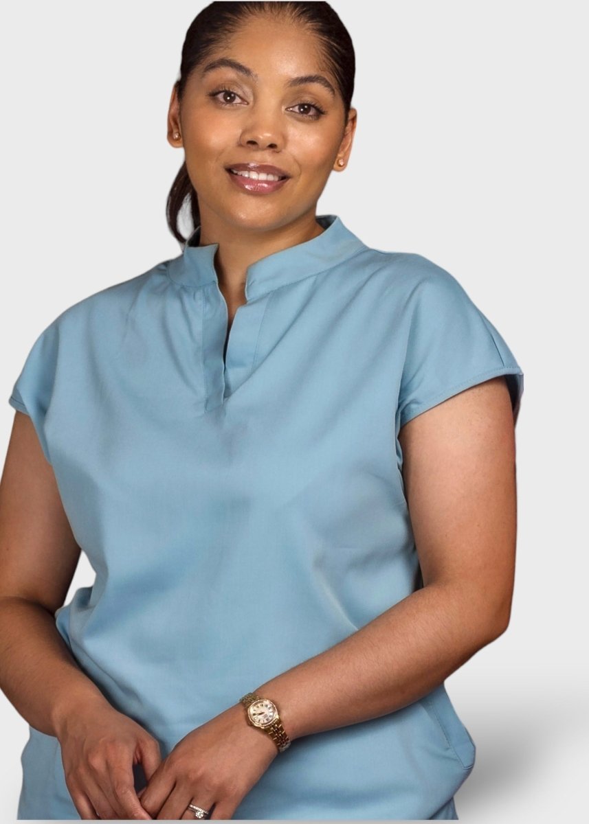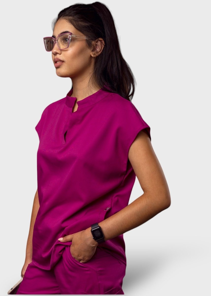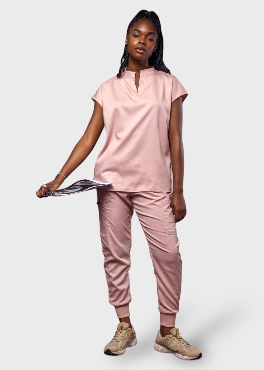 loose-fitting scrub set, the top features a Tibetan-inspired collar, designed to prioritize flexibility.